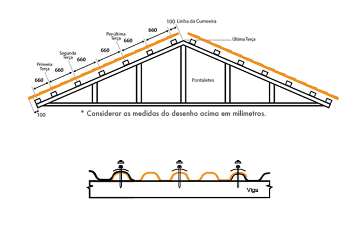 • A quantidade de parafusos por telha varia de acordo com o modelo do telhado, com a média de 8 à 10 parafusos.